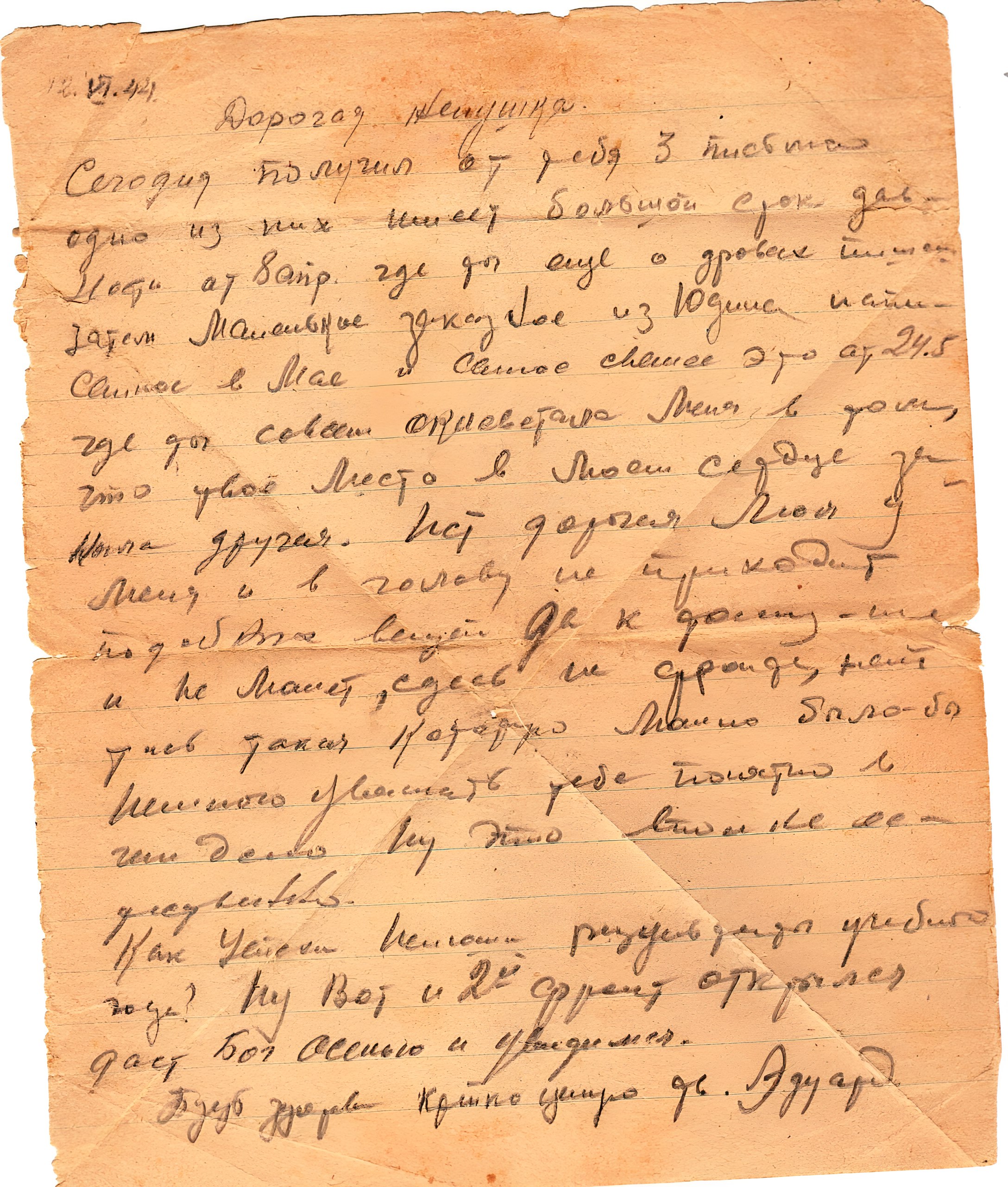 Дорогая женушка! Сегодня получил от тебя три письма. Одно из них имеет большой срок давности — от 8 апреля, где ты еще о дровах пишешь. Затем маленькое заказное из Юдино. И самое свежее от 24 мая, огоде ты меня оклеветала, что в моем сердце место заняла друга. Нет, дорогая моя. Мне и в голову не приходило подобное. Да и нет здесь таких, тебе понятно, в чем дело. И это вполне естественно. Как успехи Ксюши? Результат учебного года. Вот и второй фронт открыли. Даст Бог, осенью и увидимся. Будь здорова. Крепко целую. Твой Эдуард.