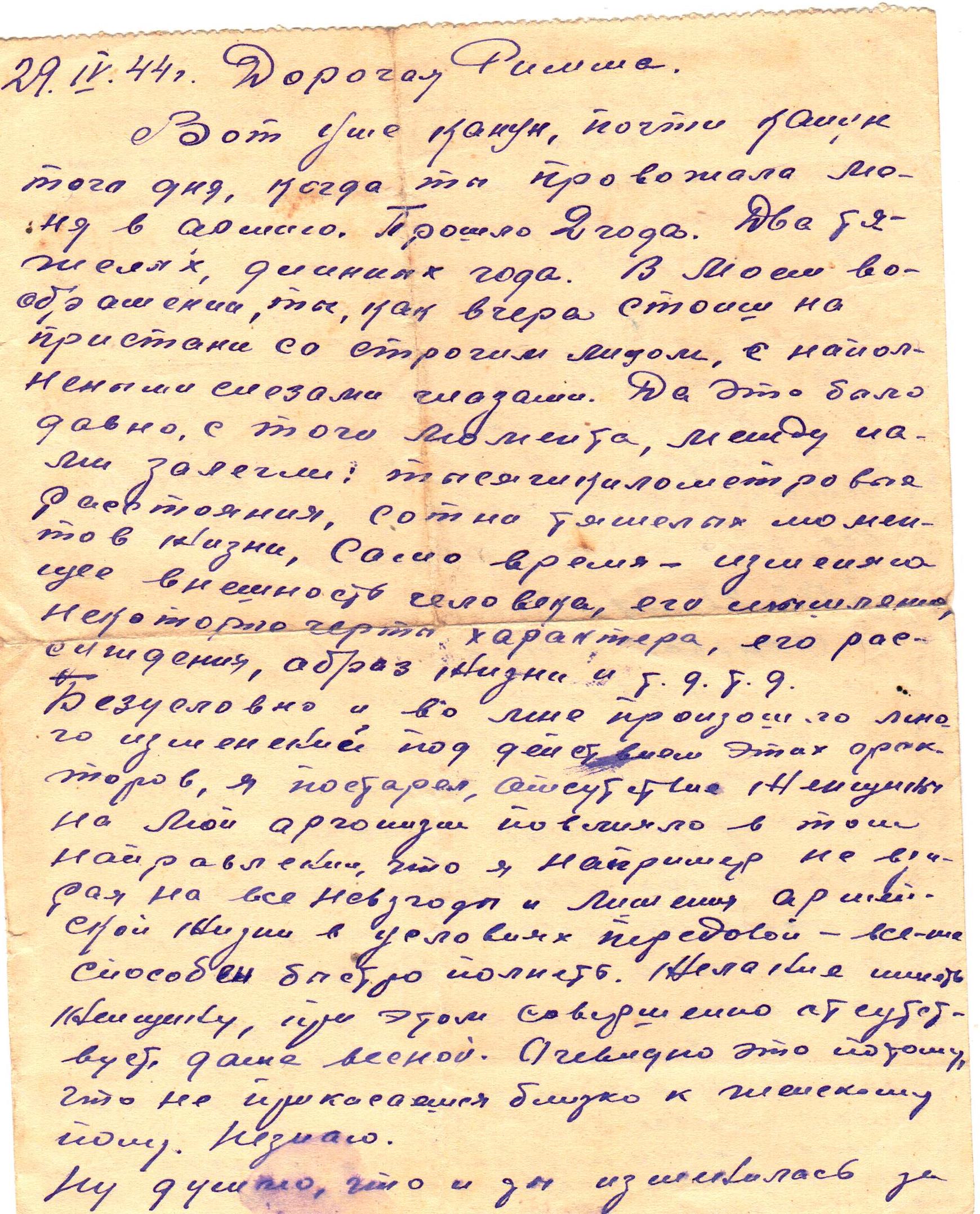 Дорогая Римма, вот уже канун, почти канун того дня, когда ты провожала меня в армию. Прошло два года, два тяжёлых, длинных года. В моём воображении ты, как вчера, стоишь на пристани со строгим лицом, наполненным слезами глазами.