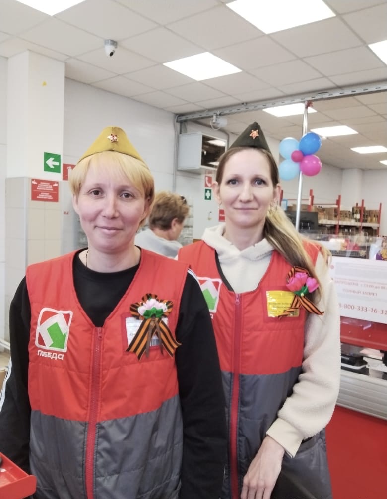Продавцы также подготовились к важному дню: на груди у них прикреплены значки с георгиевскими лентами, а на головах — пилотки.