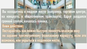 Вы находитесь в людном месте (например, торговом центре, на концерте, в общественном транспорте). Вдруг раздался громкий хлопок, началась паника.