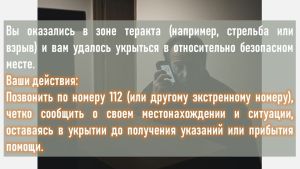 Вы оказались в зоне теракта (например, стрельбы или взрыва) и вам удалось укрыться в относительно безопасном месте.