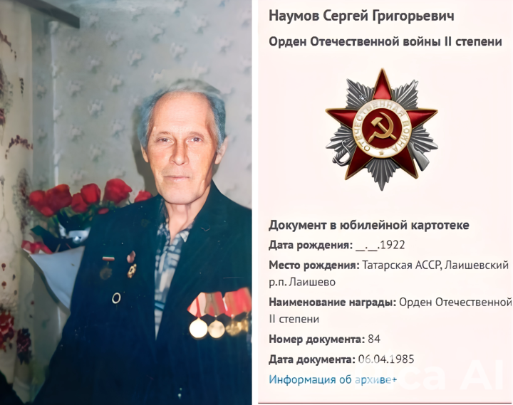 Минем бабам Наумов Сергей Григорьевич (30.09.1922 елгы) Бөек Ватан сугышы башланган беренче көннәрдән үк мобилизацияләнә һәм укчылар полкына җибәрелә. Бабай кече сержант була, ул, ил алдындагы бурычын үтәп, немец оккупантларына каршы фидакарьләрчә көрәште.